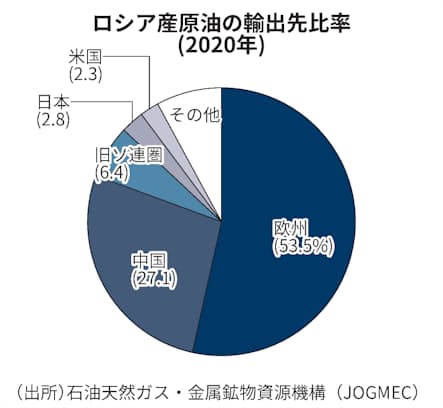 石油天然ガス・金属鉱物資源機構(JOGMEC)によると、ロシア産原油輸出全体に占める米国向け比率は2020年時点で2.3%にとどまる一方、欧州向けは約5割を占める。